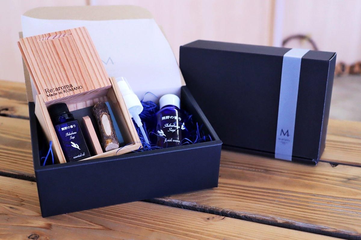 とれたて熊野杉Shibaharaのエッセンシャルオイルと香りを楽しむためのクロモジの枝を紀州材の木箱にセット。